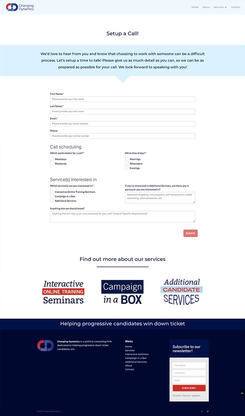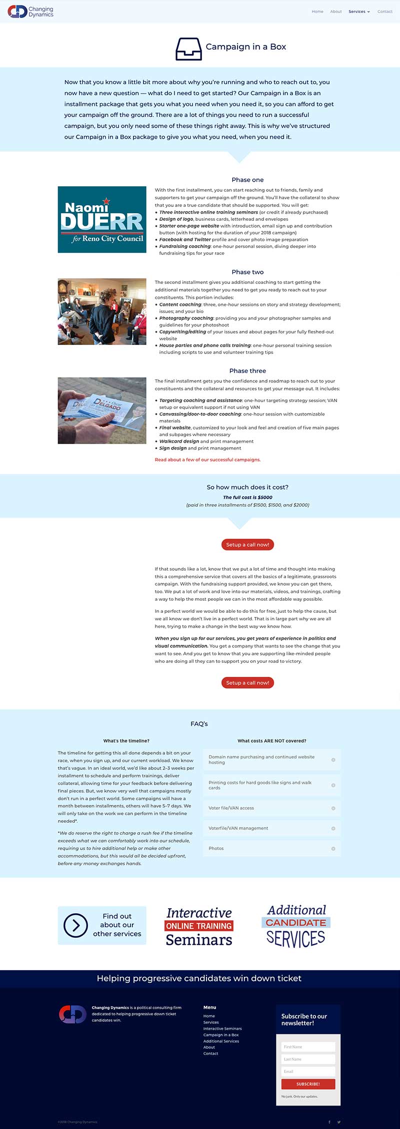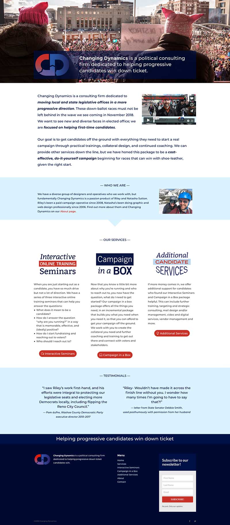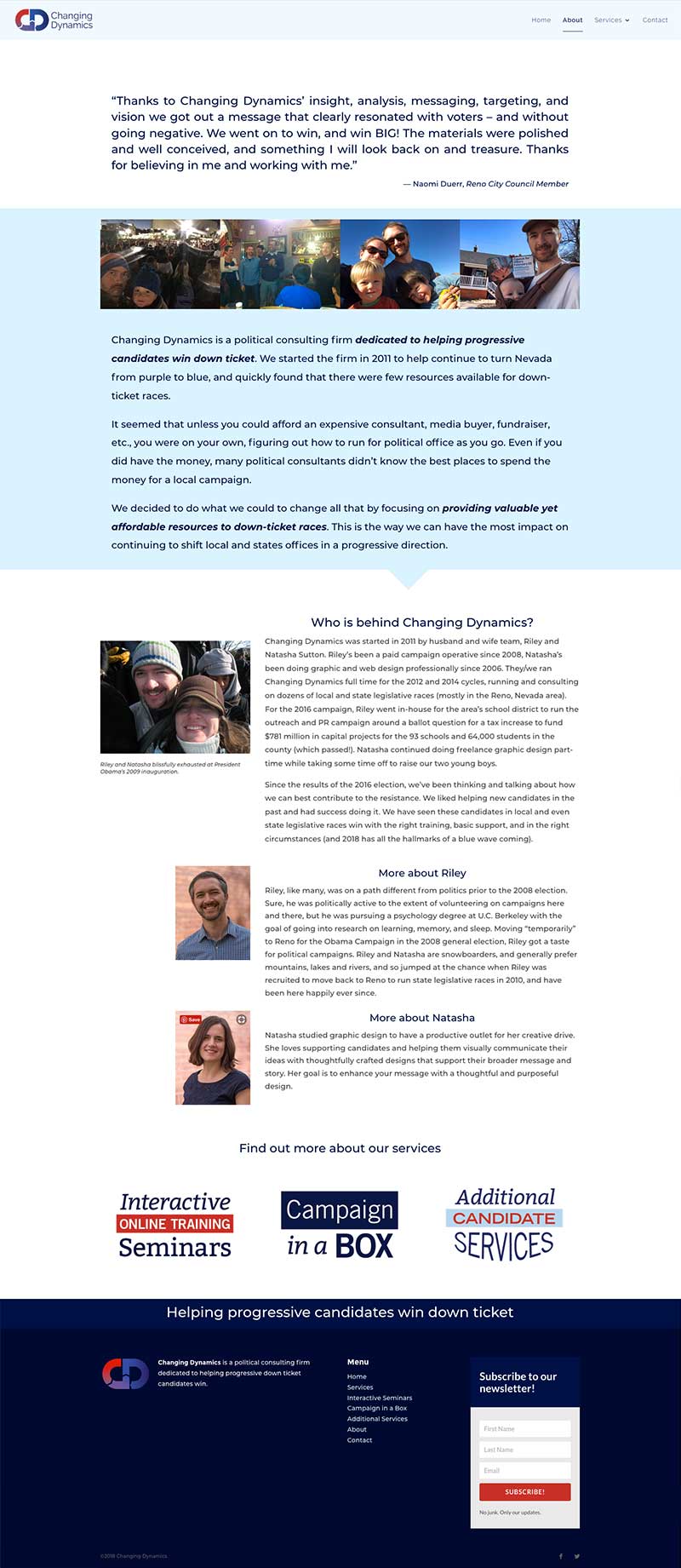 At the beginning of 2018, my husband and I decided to restart Changing Dynamics, a political consulting company my husband had created before taking a job to help get an initiative passed that would allow for capital funding for our local school district. The initial logo and website were created in 2011 and definitely needed a refresh. New logo, website, services, etc. We had learned a lot and wanted to enter into political campaigns differently this time.