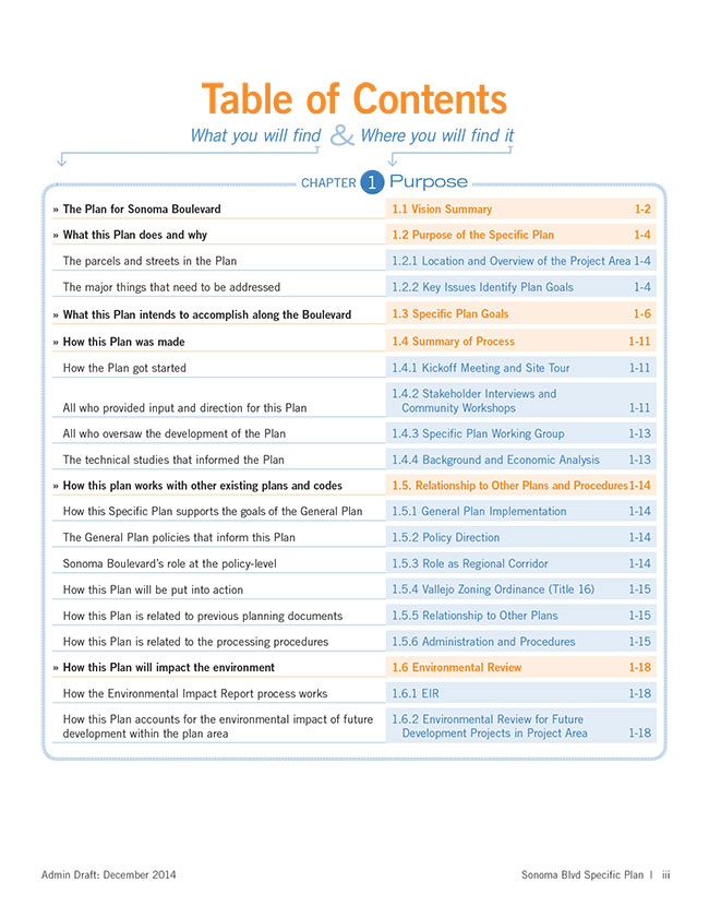 The Vallejo Specific Plan was an interesting challenge. The client wanted to reduce a document that is typically several hundred pages and hard to follow to the leanest and user-friendly document as possible. This required a lot of rethinking in both the document design and content creation.