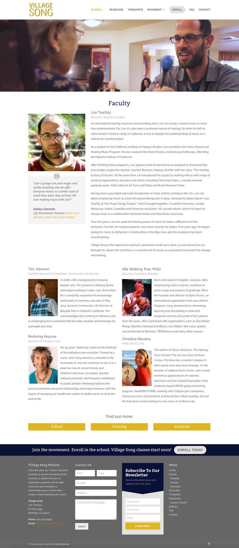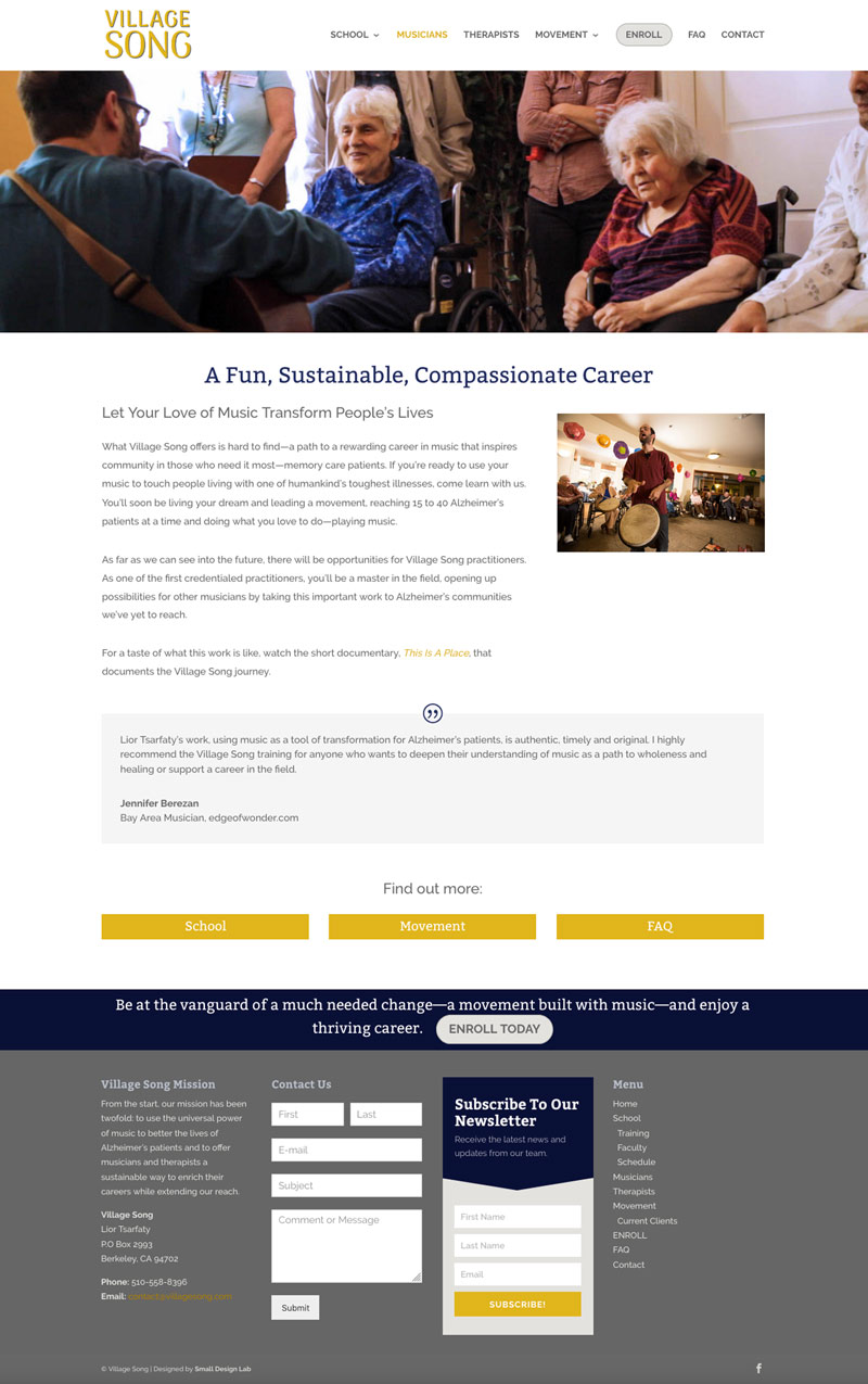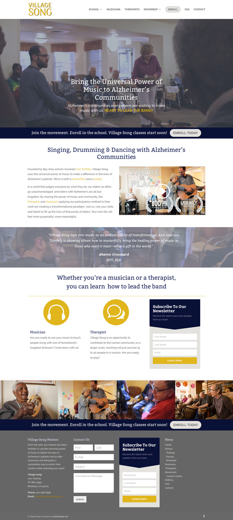 Lior Tsarfaty had a vision to create a school and movement for bringing the power of music to Alzheimer’s communities. For the last 5 years, he had been doing this himself in the bay area, and the positive effect it had on that community was truly powerful. The demand for his services increased, and he quickly realized he couldn’t do this alone. He wanted to teach other musicians and therapists to serve this often forgotten about community. He asked Small Design Lab to join the team to bring this to life. He had a vision of what it could be but not how to get there. SDL joined the team to help bring the visual side to life.