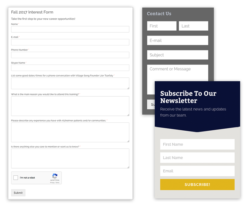 This website required multiple forms. Two were created for Mailchimp integration, one in the footer and one for the sidebar. Two additional forms were created for contact and for the interest form, which involved more information. These forms were tested and integrated to ensure they reached his Google Apps inbox.